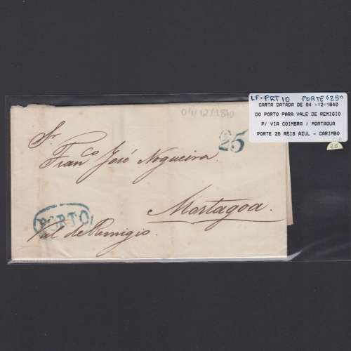 Carta pré-filatélica datada 04-12-1840 com carimbo origem do Porto circulada para Vale de Remigio com taxa aplicada 25 réis