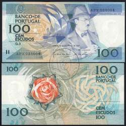Portugal, banknote 100 Escudos 1987 Fernando Pessoa Plate 9 - Bank of Portugal Lisboa 12 february 1987, one hundred Escudos (100$00) 12.02.1987, serial number: APN 034004, signatures O Governador: José Alberto Vasconcelos Tavares Moreira - O Vice-Governador: Alípio Barrosa Pereira Dias, World Paper Money Portugal Pick#179.b