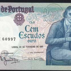 Nota de 100 Escudos 1981 Bocage Chapa:8 Lisboa 24 de fevereiro de 1981, cem escudos (100$00) 24/02/1981 Chapa:8 Banco de Portugal, Numero série: ANM 60997, Assinaturas O Governador: Manuel Jacinto Nunes - O Vice-Governador: Emilio Rui da Veiga Peixoto Vilar, World Paper Money Portugal Pick#178.b