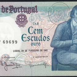Nota de 100 Escudos 1981 Bocage Chapa:8 Lisboa 24 de fevereiro de 1981, cem escudos (100$00) 24/02/1981 Chapa:8 Banco de Portugal, Numero série: BFF 69699, Assinaturas O Governador: Manuel Jacinto Nunes - O Administrador: Joaquim Cavaqueiro Mestre, World Paper Money Portugal Pick#178.b