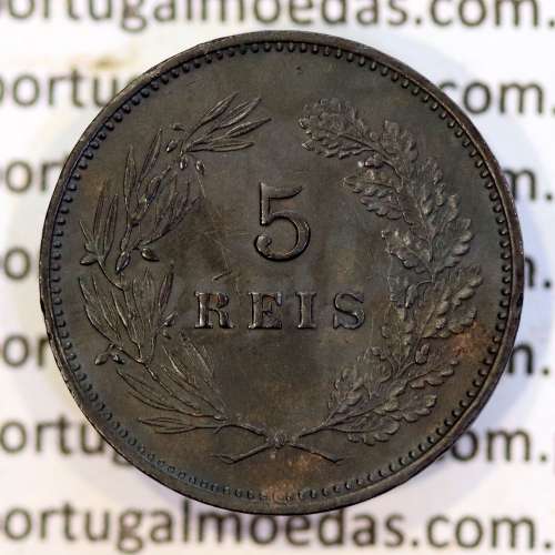 Ao centro dentro de coroa de dois ramos em que o ramo direito é de carvalho e o ramo esquerdo é de loureiro, o valor facial "5 REIS" em duas linhas, no rebordo circulo liso seguido de circulo perolado.