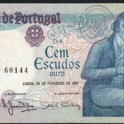 100 Escudos 1981 Bocage Chapa:8 Lisboa 24 de fevereiro de 1981, cem escudos (100$00) 24/02/1981 Chapa:8 Banco de Portugal, Numero série: ADG 60144, Assinaturas O Governador: Manuel Jacinto Nunes - O Administrador: Alberto José dos Santos Ramalheira, World Paper Money Portugal Pick#178.b