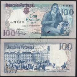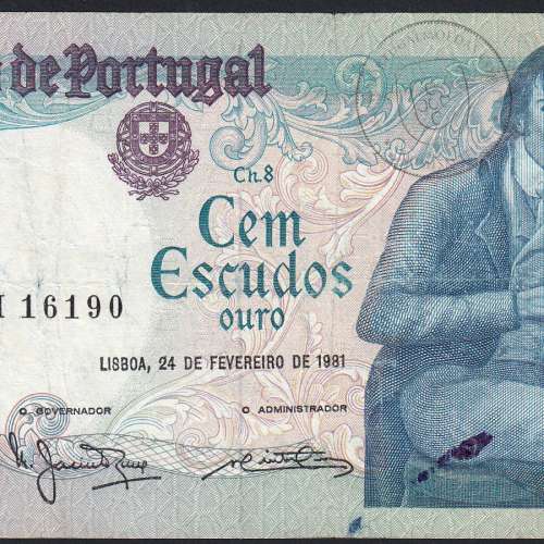 100 Escudos 1981 Bocage Chapa:8 Lisboa 24 de fevereiro de 1981, cem escudos (100$00) 24/02/1981 Chapa:8 Banco de Portugal, Numero série: AJM 16190, Assinaturas O Governador: Manuel Jacinto Nunes - O Administrador: Abel António Pinto dos Reis, World Paper Money Portugal Pick#178.b